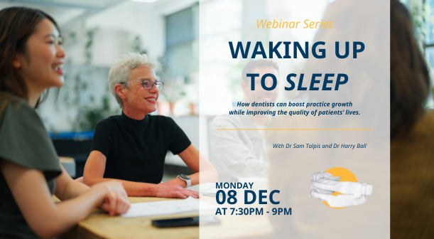 “Organising and Presenting Sleep Studies – Everything a Dentist Needs to Know.” Presented by: Dr. Marcus McMahon, Sleep Physician, and Dr. Harry Ball, Dentist An exclusive webinar with two experts in the field. Providing oral appliances for snoring, sleep apnoea, and bruxism is a valuable service for a dental practice.